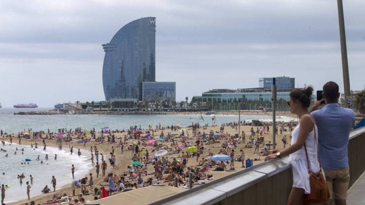 Hotel Vela y las masificadas playas de la Barceloneta; antaño barrio de obreros y pescadores y cuna de diversas reevindicaciones sociales