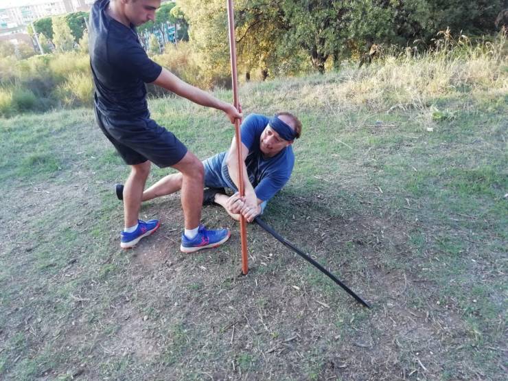 Aprovechando esa circunstancia pasamos la punta del bastón o la lanza entre el hueco dejado por las manos que sujetan el mango de la espada, deslizando el mismos hacia su antebrazo –izquierdo o derecho, en función de qué lado estemos utilizando el bastón, tal como se parecía en la figura 2-