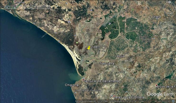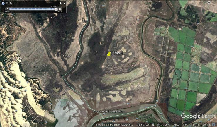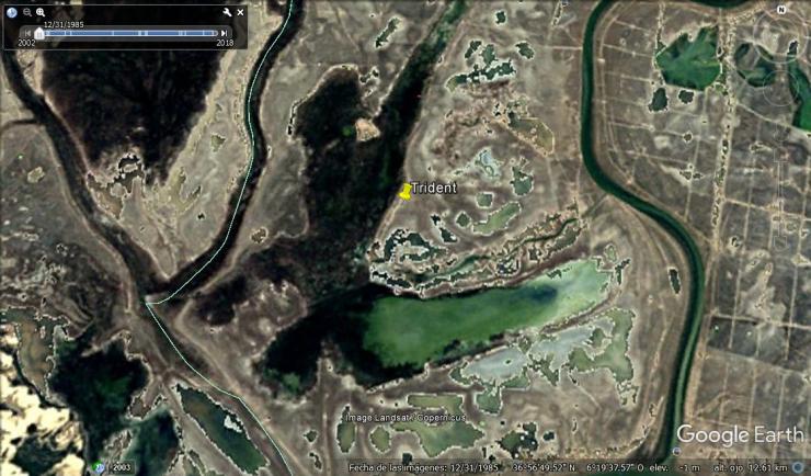 Como colofón, me gustaría que observaseis estas dos fotos satelitales del área correspondiente cercana al Lucio del Rinconcillo -Doñana- La primera es de 1984, la segunda del 2002 y la tercera es del 2020 -atención a la marca denominada «Trident»-. Si os fijáis en la primera y segunda imagen satelital, las barras de arena y sedimentos coinciden con la descripción de Platón sobre la capital de la Atlántida –integrada por círculos concéntricos de tierra y mar, lo que nos da la pista de ser una isla, la cuál debía de encontrarse en una zona de poca profundidad y con pocas corrientes marinas, como una ensenada o un lago marino-