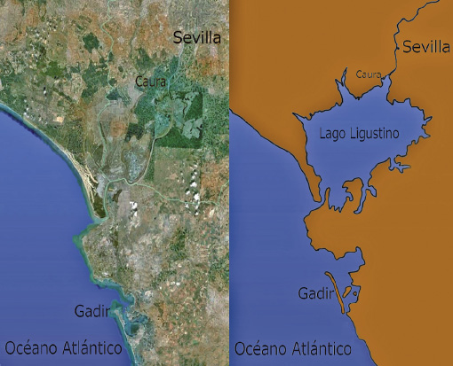 No obstante, al parecer este lago fue producto de un cataclismo geológico que provoco la inundación y creación del mismo, siendo en época romana un vestigio de lo que había sido, el cual, aunque navegable, se encontraba en proceso de desecación y transformación de las actuales marismas del Guadalquivir. Al parecer su punto álgido –que abarcaba una notable extensión, no solo en la desembocadura del Guadalquivir, sino que llegaba hasta el llano de Sevilla, con sus rebordes cerca de las poblaciones de Aljarafe y los Alcores- se dio en el período comprendido entre el denominado “Máximo Transgresivo Flandriense” -ca 6000 AP o 6000 a.C- y el 2000 AP o a.C…. y que evento geológico coincide con dicha fecha?